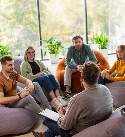 - Terapeuta przekazuje wiedzę psychologiczną oraz prowadzi ćwiczenia i dyskusje o emocjach i relacjach.